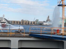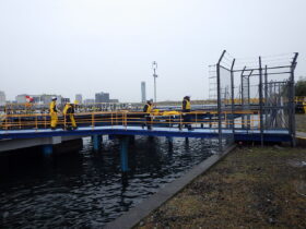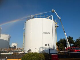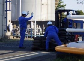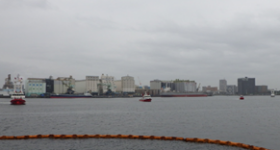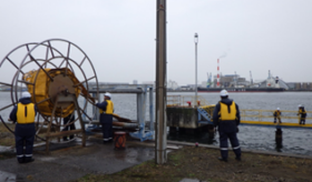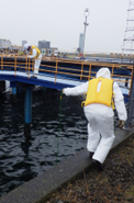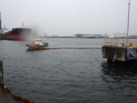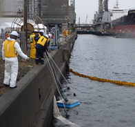 ・大小のオイルフェンスを使用されていて参考になった。展張時の手際がよく、日頃から訓練されていると思った。また、オイルフェンスのガイドレール取付け箇所には手動ウィンチ等補助用治具が設置され、一人作業でも操作し易いような安全面での工夫を感じ、自職場でも設置検討してみたい。