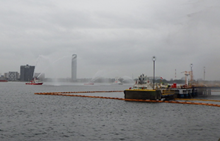 被災船舶から流出した重油を拡散する為、消防艇による放水航行を実施。